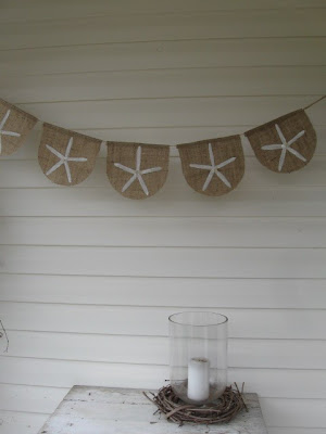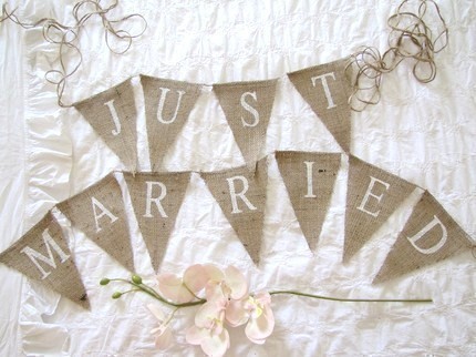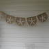 Burlap pennants (above) with white glittered font, simple and beautiful with extra extra long jute twine
