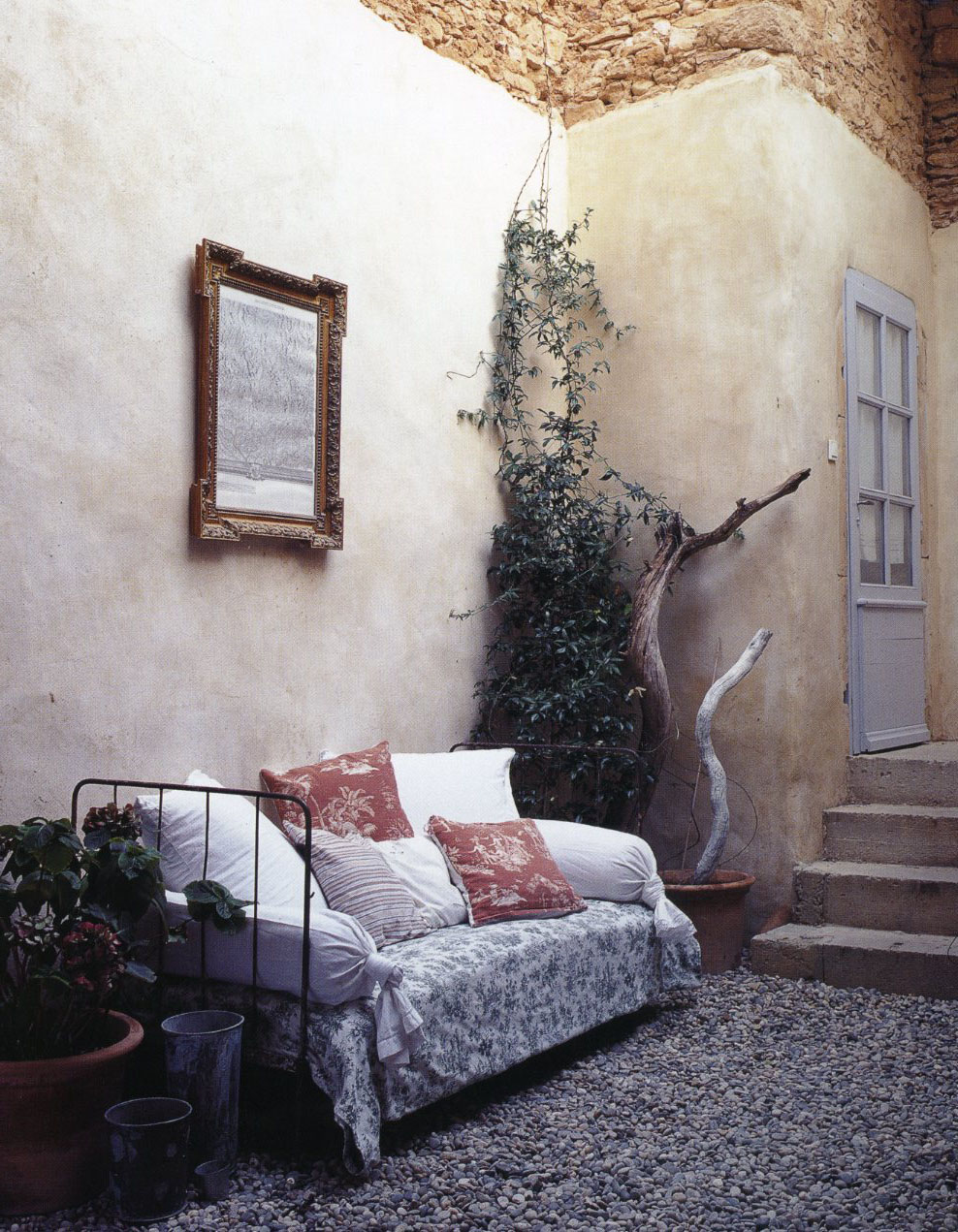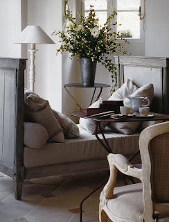 The French always seem to draw my gaze to their great furnishings. Take the Louis XVI-period day bed (below left) or the sweet garden chair (below right) upholstered in chenille (nifty little idea!). They both are so casually welcoming.