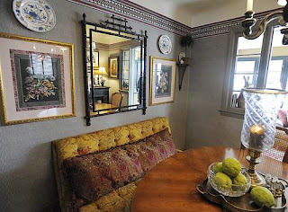 Our home's design scheme isn't blue and white, yet I still rate these two banquettes above high on my list of delightful spaces. The breakfast room banquette featured in Better Homes and Gardens (left) is bright and cozy, although I give my top vote for rustic romance to the Country Living magazine photo (right). If I ever build a vacation cottage, this will be the inspiration. Since I already own the table - a gift from a friend who found it at a flea market, I just need to source the chairs and have my super handyman husband at the ready for the built-in construction.