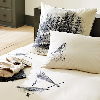 The sweet, 100% linen Chinoiseri Long Pillow (above left) is $98 from Dwell Studio. It measures 24" x 12" and includes the 100% feather down insert. West Elm's Vintage Bird Duvet Cover and Shams (above right) sell for $29 - $139.