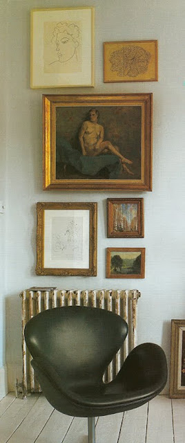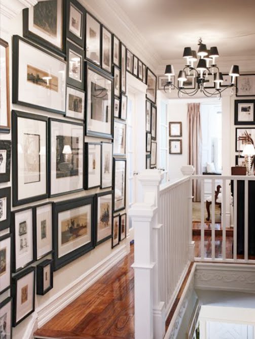 Designer Charlotte Moss gives the wall (above left) a casual, French asthetic, using an imaginary line just above the desk as her placement axis. In a similar way, the hallway gallery on the right (from Domino magazine) has a definite formal flare, taking its horizontal cue from the crown moulding.