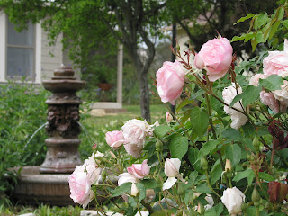 Follow the sandstone pathway, pass the rose gardens and fountain ... then, the pergola garden of plumbago, salvia, esperanza and Pride of Barbados ... and, finally the cottage garden to reach the steps to the studio.