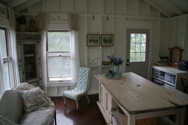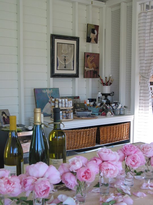 My studio has a decidedly country French feel, with vintage finds, including my beloved antique workbench from the Czech Republic. It serves double duty as a wine-tasting table when we entertain. |