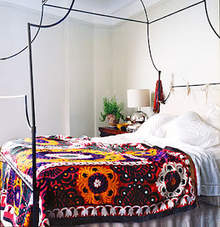 These images above from House Beautiful (left) and Hip Marrakech (right) reflect the subtle color and texture suzanis can lend to a room's decor without creating a 'theme' that is over the top.