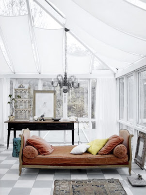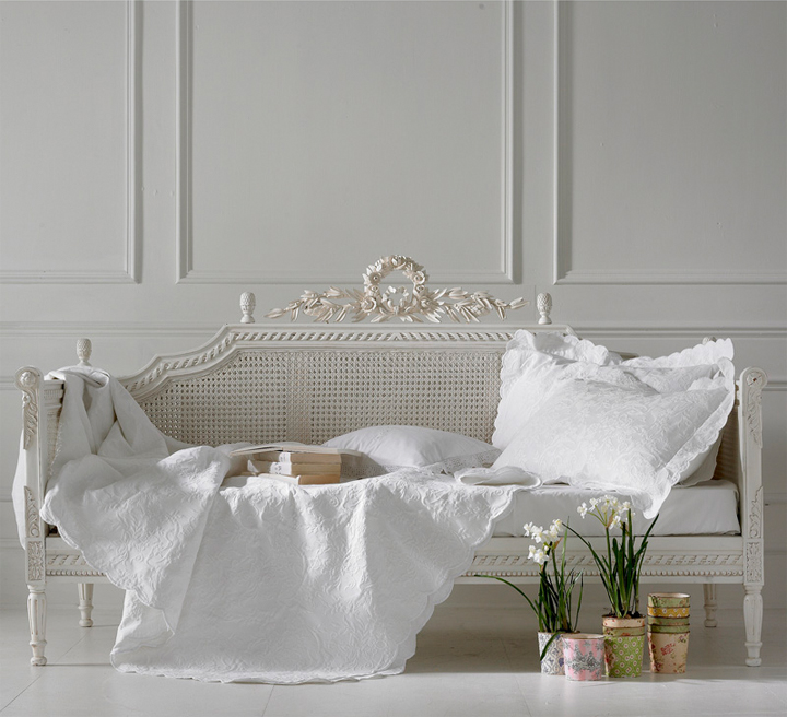 Both of the daybeds below bask in natural light and invite leisurely pursuits. The Grogan family home in Pennsylvania (left) is a lovely study of casual comfort. On right, Country Living magazine showcases a beach cottage's antique daybed dressed in Provencal linens.