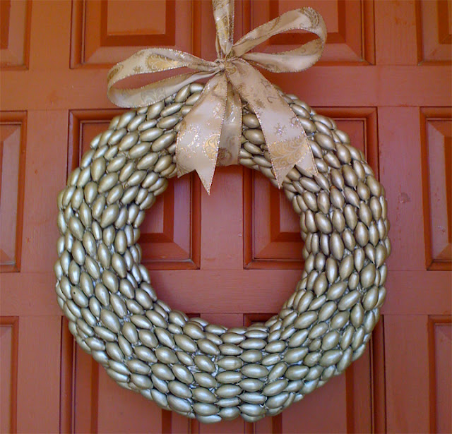 It's a simple project that requires only a straw wreath, acorns, glue, the paint color of your choice and some ribbon.
