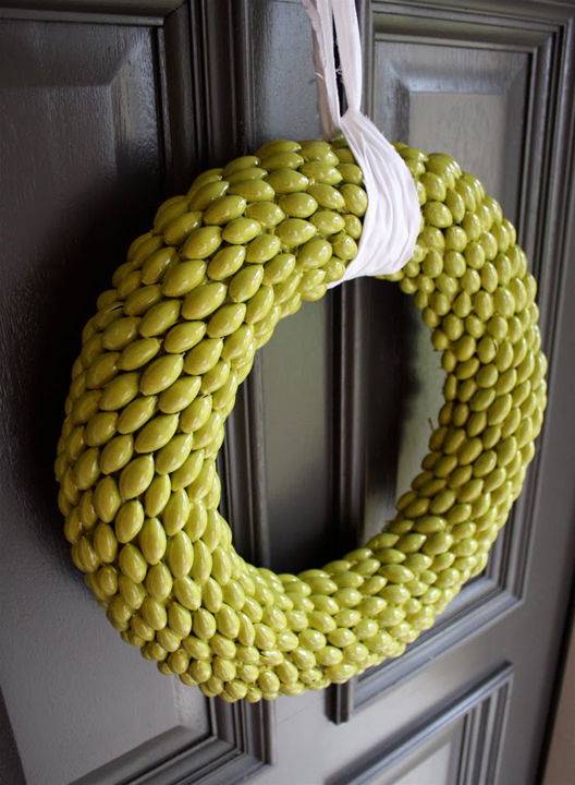 Glue. Heat up a hot glue gun. Using an inexpensive straw wreath (about $1.99) as the foundation, begin to glue the acorns to the wreath. Snugly fit the acorns in a pattern with the pointed end always headed in the same direction. Don't bother to glue acorns on the back, since no one will see it and this will allow the wreath to lie flat against the door.