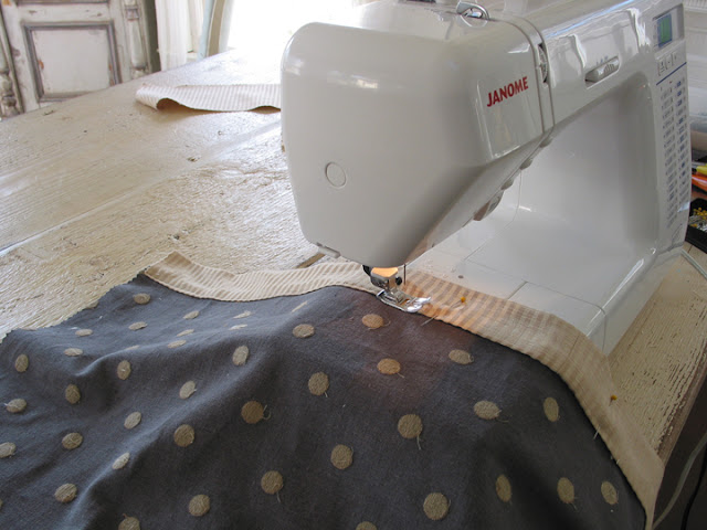 I selected the linen dot fabric for the main section of the runner and cut it 15" wide. I measured my table with leaves to determine the length of the runner. I wanted the stripes of the border fabric to run perpendicular to the main runner, so I cut a number of strips each 5" wide. The strips were sewn together end to end until I had ample to length to match the length of the main runner fabric.