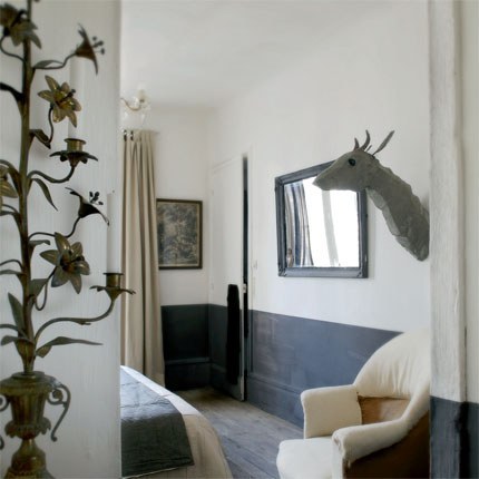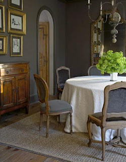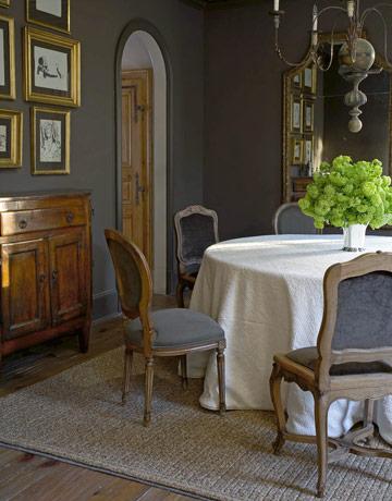 Not ready for an entirely gray room? Take a page from the design scheme below, and only paint the lower half of the walls. The rich charcoal truly anchors these rooms with European pinache.