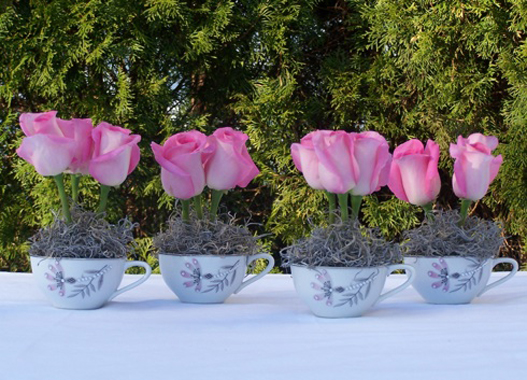 Roses are always appropriate and certainly send a message of love. The rose-filled little teacups (below) are a terrific way to stage the table. This is a clever idea from Porter House Designs. Charming!