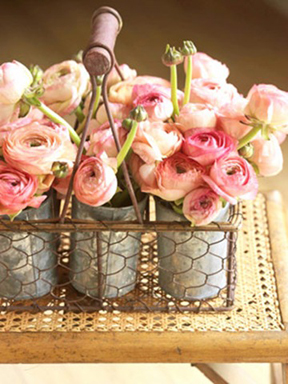 Add some hyacinth and tulips (above left) to the ranunculus for a formal mixed bouquet, or let them shine solo in antique tins for casual elegance (above right).