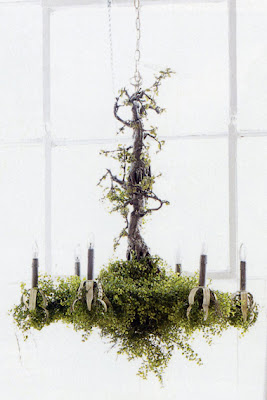 Perhaps, we may want to dress up or cover up our creation. The chandelier (above right) from Canopy Designs shows how a twist of unexpected natural material can really grow on you.