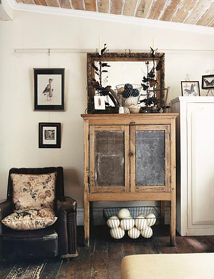 Both of these antique sideboards take center stage in their settings. To get the look, utilize old baskets, bins and vintage luggage to corral odds and ends, then, bring in complementary accessories to personalize the space. Photos via Decor Pad (above) and Eclectic Revisited (below).